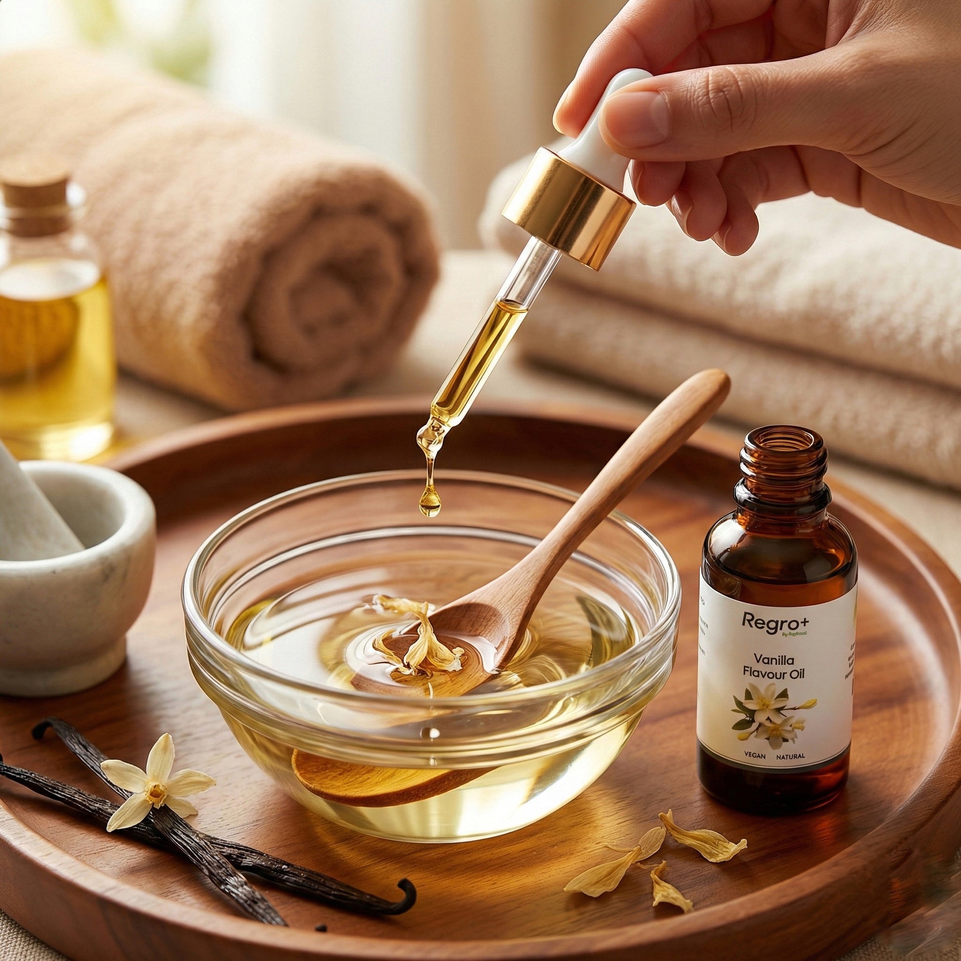 A warm and comforting body oil with a natural vanilla aroma that soothes both skin and senses. Regro Vanilla Flavor Oil helps hydrate dry areas, calm irritation, and promote a soft, smooth feel. Ideal for massage or daily body care. Halal-certified and free from synthetic additives.