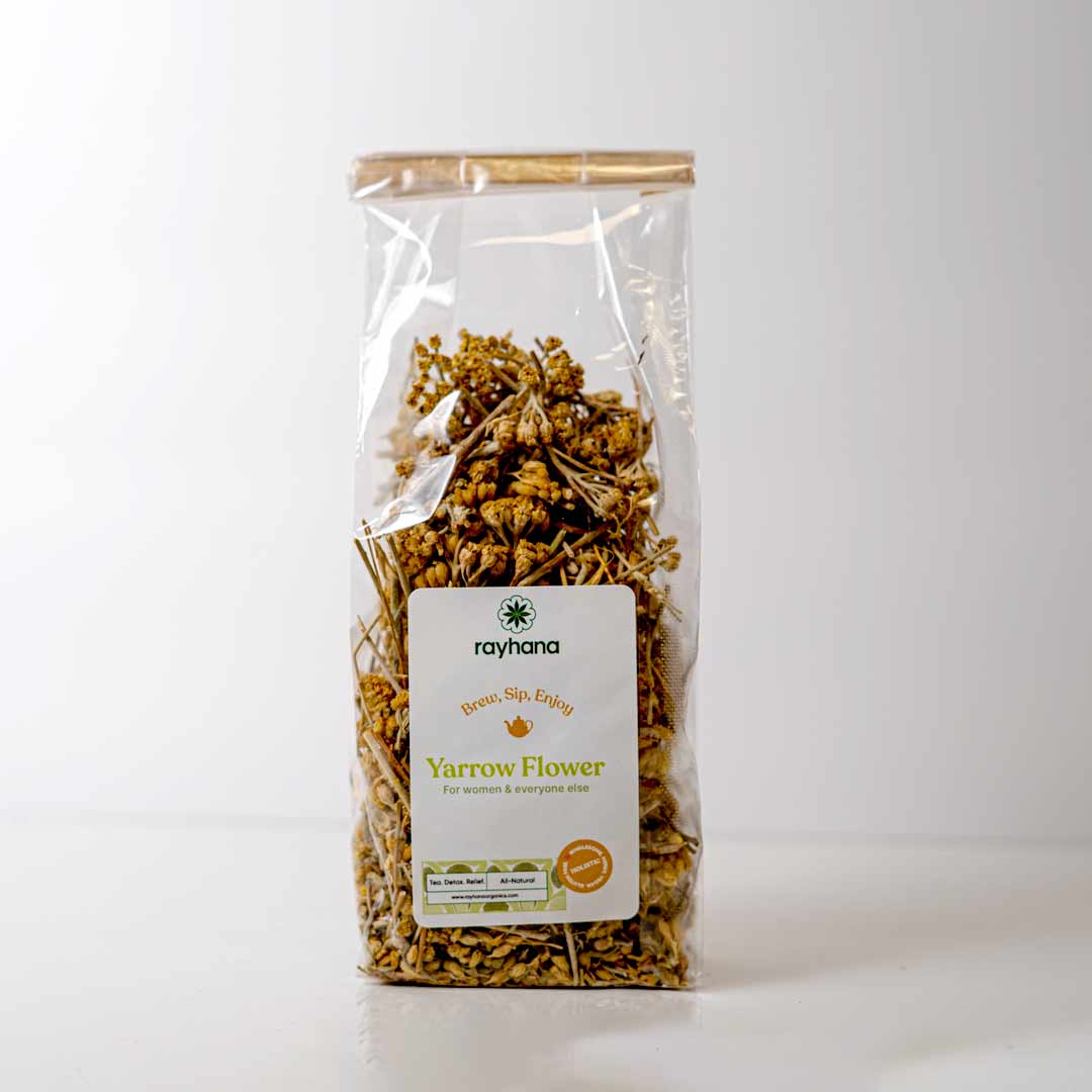 Yarrow Flower by Rayhana Organics is a traditional herbal ingredient valued for its aromatic, earthy character. Dried carefully to preserve its natural properties, this caffeine-free herb can be enjoyed as a simple infusion or blended with other botanicals for a balanced herbal tea.